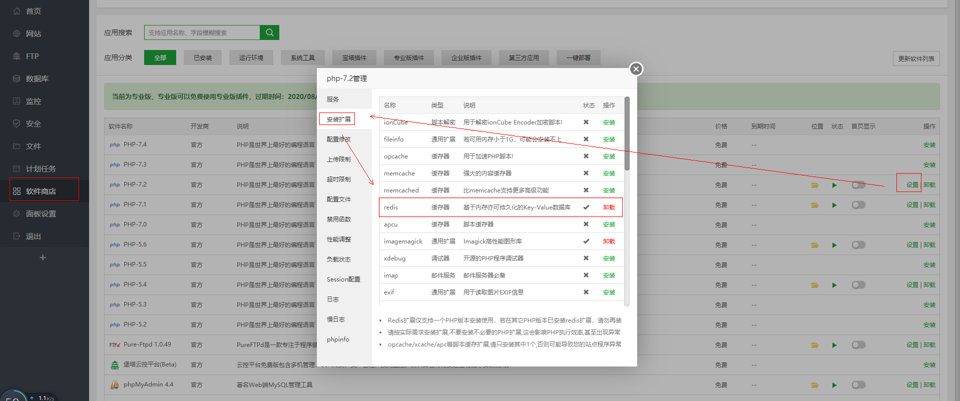 2.软件管理-PHP7.2-设置-安装扩展-Redis,点击安装
